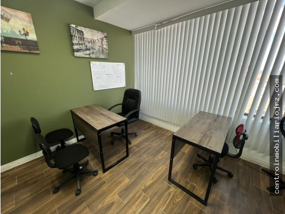 Esta equipada con dos escritorios, sillas, refrigeracion y calefacción, servicios incluidos. Sala de juntas equipada con una mesa con 6 sillas y televisión para proyectar.